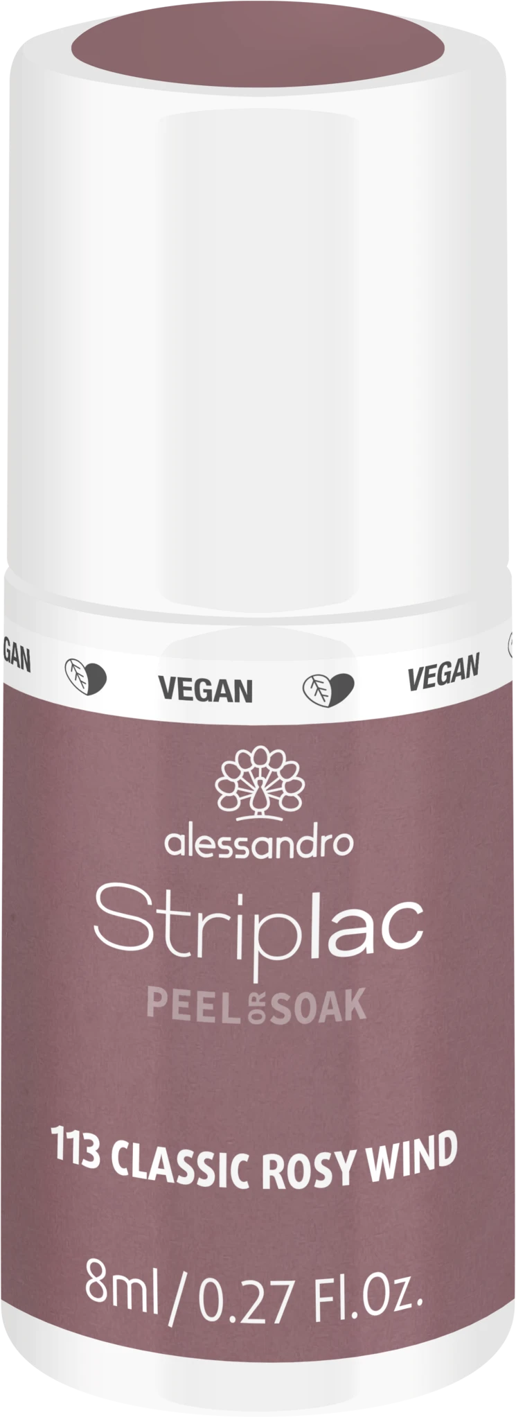 Zeitloser Glanz: Der Peel or Soak Striplac Classic Rosy Wind ist ein echter Klassiker, der Farbton in verträumtem Taupe sorgt für neuen Glanz und wunderschön-rosige NägelDas Beste– STRIPLAC ist VEGAN und TIERVERSUCHSFREI!Leichtes Auftragen, keine Trocknungszeit und bis zu 3 Wochen Haltbarkeit? Kein Problem! Einfach eine Schicht Classic Rosy Wind Striplac auftragen und mit dem Top Coat versiegeln. Dank der Peel or Soak Innovation lässt sich der Lack gleich auf zwei Weisen entfernen: Mit dem Peel- Off Aktivator kann der Lack mit Hilfe eines Hufstäbchens in einer Schicht entfernt werden, mit dem Soak-Off Liquid wird dieser mit Hilfe der Folienpads sanft abgelöst. alessandro Striplac – für zeitlos-stilvolle Nägel in nur 15 Minuten!Produktdetails• Classic Rosy Wind Striplac im klassischen Taupe• Bis zu 3 Wochen Haltbarkeit• Keine Trocknungszeit• Schnelle Peel-Off oder Soak-Off Ablösung• Schützt und festigt den Naturnagel • VEGAN und Tierversuchsfrei• Hinweis: Lack trocknet nicht ohne alessandro LED-LampeStriplac Peel or Soak ist das Must-Have für jede Frau, die Wert auf schöne Nägel legt! Nägel wie aus dem Nagelstudio in etwa 15 Minuten! Striplac ist ein einzigartiger Nagellack, der wesentlich länger hält als herkömmlicher Nagellack – bis zu drei Wochen. Hochglanz bis zum letzten Tag! Striplac kann einfach und streifenfrei aufgetragen werden, deckt bereits nach der ersten Anwendung, ist kratz- und splitterfest. Keine lästige Trockenzeit, denn Striplac härtet in 60 Sekunden im LED-Gerät. Das Ergebnis ist eine perfekte UV/LED-Maniküre wie aus dem Nagelstudio. Das Beste– STRIPLAC ist VEGAN und TIERVERSUCHSFREI!Zum schnellen Ablösen gibt es zwei Möglichkeiten: Schnelle Peel-Off or Soak-Off Lösung. Durch den Peel-Off Aktivator lässt sich der Striplac einfach vom Nagel abziehen oder Sie nutzen die Soak-Off Remover Wraps zum Ablösen. Der Lack ist mit beiden Lösungen rückstandslos zu entfernen.