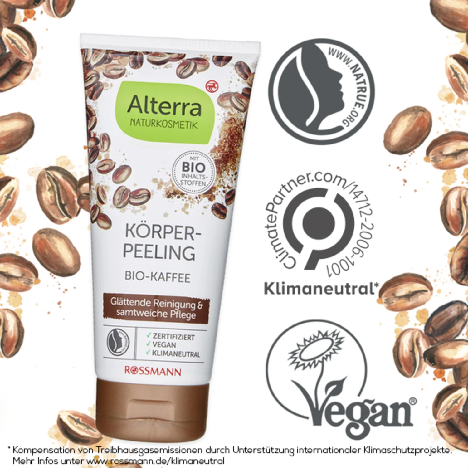 Erleben Sie die glättende Reinigung und wohltuende Pflege des Alterra Body-Peelings Bio-Kaffee für den gesamten Körper.