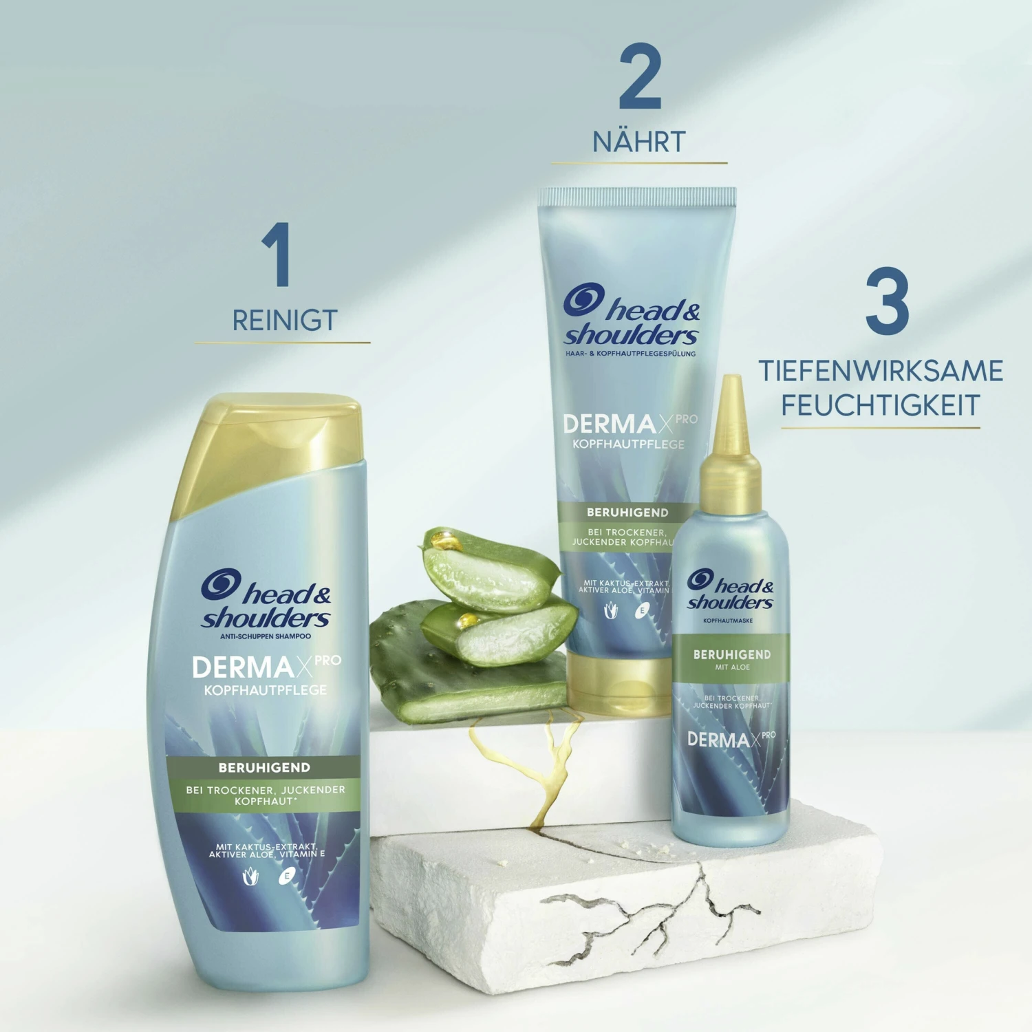 Ultimative Pflege für die Kopfhaut! Head & Shoulders DERMAXPRO beruhigende Kopfhautmaske ist mit der hautpflegenden Substanze aktiver Aloe angereichert und basiert auf dem klinisch getesteten Wirkstoff Pirocton Olamin. Das Ergebnis? Eine mit Feuchtigkeit versorgte, schuppenfreie* Kopfhaut. *sichtbare Schuppen, bei regelmäßigem Anwendung.