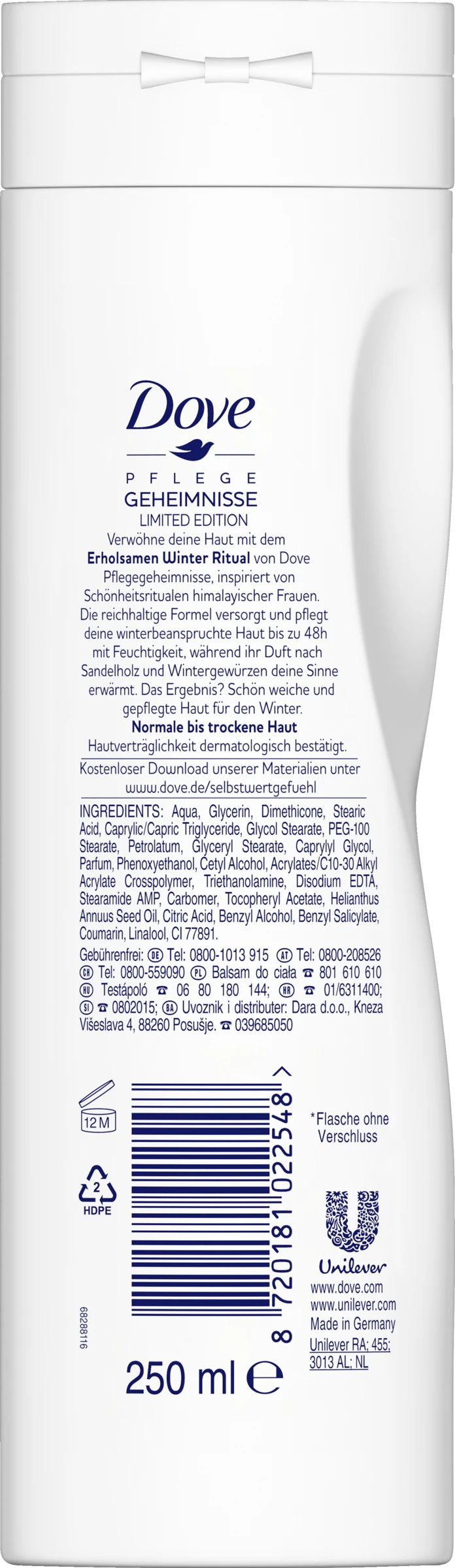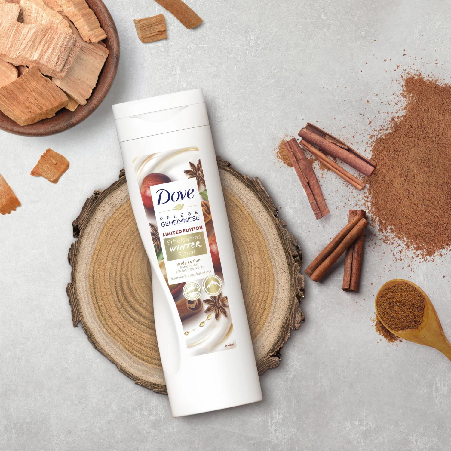 Verwöhne deine Haut mit dem Erholsamen Winter Ritual von Dove Pflegegeheimnisse, inspiriert von Schönheitsritualen himalayischer Frauen. Die reichhaltige Formel versorgt und pflegt deine winterbeanspruchte Haut bis zu 48h mit Feuchtigkeit, während ihr Duft nach Sandelholz und Wintergewürzen deine Sinne erwärmt. Das Ergebnis? Schön weiche und gepflegte Haut für den Winter.