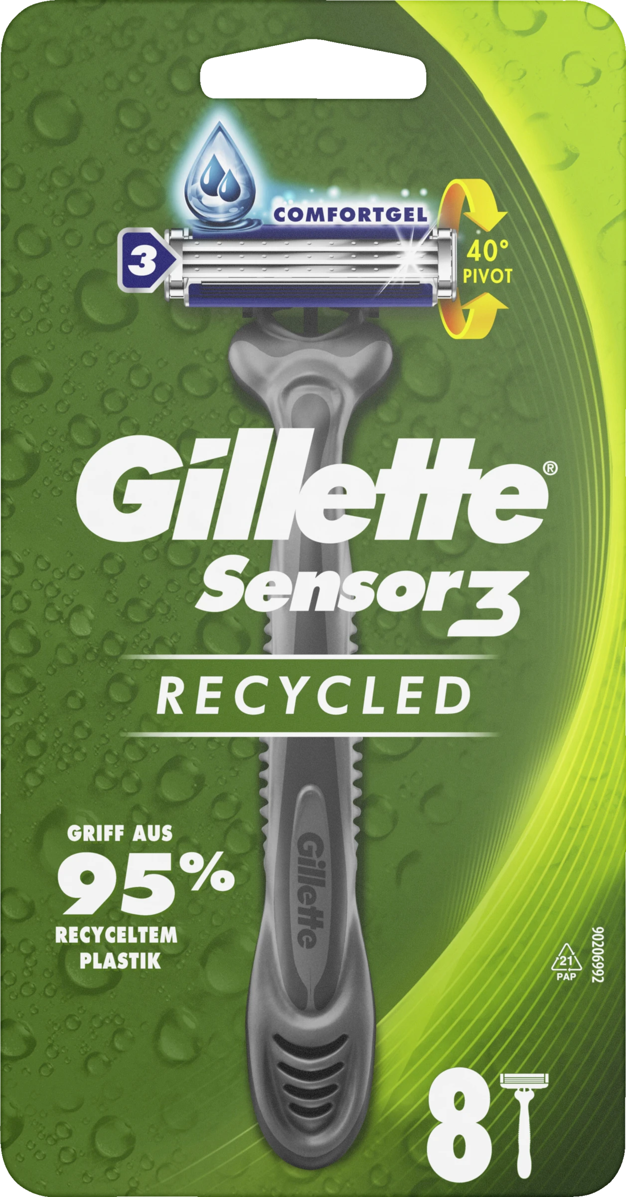 Der Gillette Sensor3 Recycled bietet die bewährte Rasierleistung des weltweit führenden* 3-Klingen-Einwegrasierers Gillette Sensor3 in einer nachhaltigeren Form. Der Griff besteht zu 95 % aus recyceltem Kunststoff und sorgt somit für einen umweltfreundlichen Einwegrasierer, der keine Kompromisse bei der Leistung eingeht.