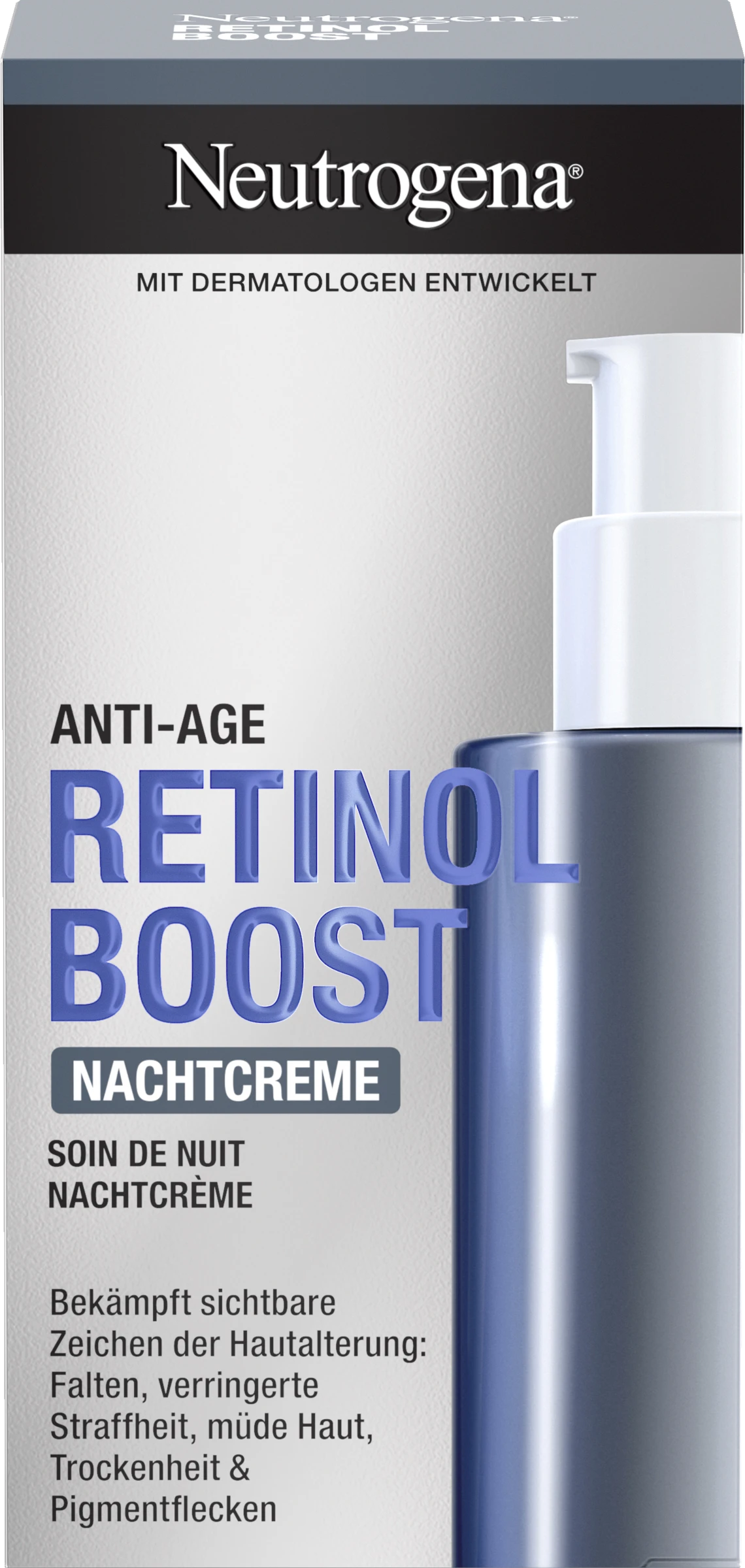 Die Neutrogena Retinol Boost Nachtcreme ist eine schnell einziehende Anti-Age Nachtpflege mit Retinol, Myrtenblatt-Extrakt & Hyaluronsäure und sorgt für jünger & gesund aussehende Haut. Die effektive Gesichtscreme für die Nacht bekämpft sichtbare Zeichen der Hautalterung: Falten, verringerte Straffheit, müde Haut, Trockenheit und Pigmentflecken. Zusätzlich verbessert die Anti-Age Creme das Hautbild, sorgt für einen ebenmäßigen Hautton und spendet sofort Feuchtigkeit. Die einzigartige Formel kombiniert reines Retinol zur Förderung der Kollagenproduktion, Myrtenblatt-Extrakt zur Steigerung der Retinol-Wirksamkeit und Hyaluronsäure für intensive Feuchtigkeit und pralle Haut. Die Anti-Age Nachtcreme für das Gesicht ist so effektiv, dass bei 100% der Testerinnen eine sichtbare Wirkung bestätigt wurde*.