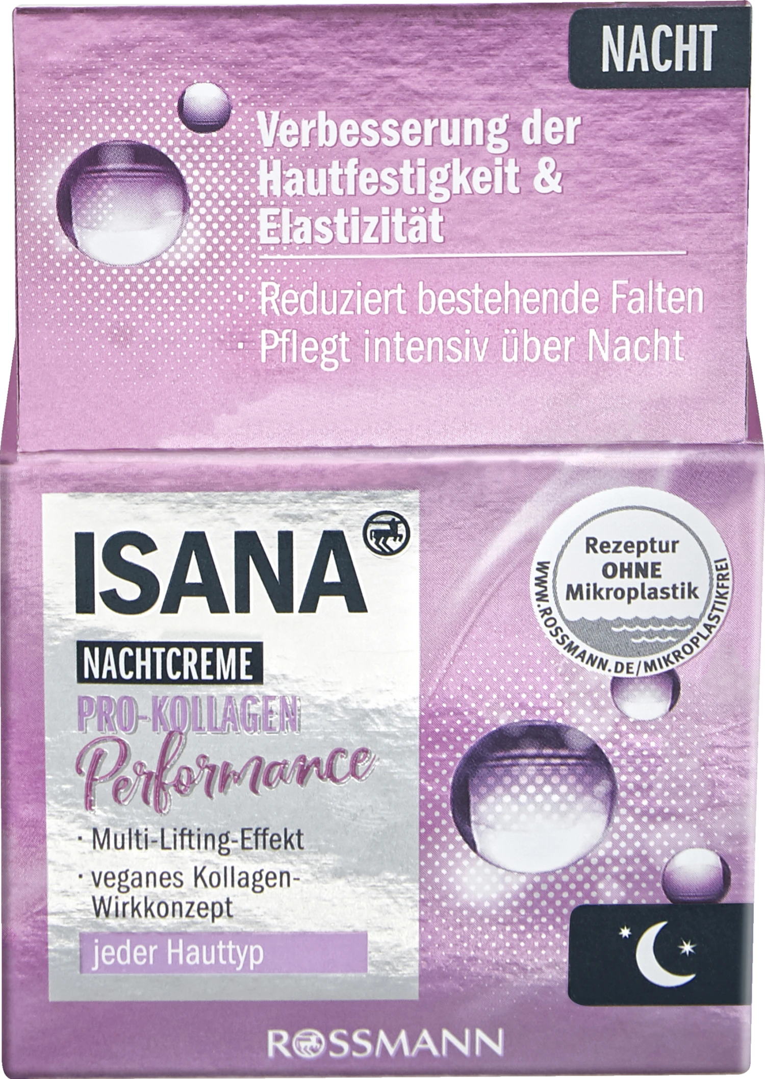 Die ISANA PRO-KOLLAGEN PERFORMANCE NACHTCREME mit ihrer modernen Anti-Aging Textur sorgt für einen Multi-Lifting-Effekt und lässt die Haut langfristig prall und straff erscheinen. Die Pflege wurde entwickelt, um die Kollagensynthese der Haut anzuregen und so ihre Elastizität zurückzuerlangen. Gleichzeitig mildert die Nachtcreme Falten und Linien.