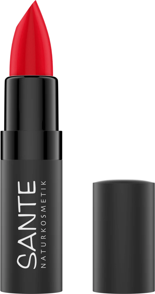 Intensive, matte Farben – ohne die Lippen auszutrocknen! Unser reichhaltiger, matter Lippenstift mit Bio-Kakaobutter im verführerischen 07 Kiss-me Red sorgt für Statement-Looks mit hohem Tragekomfort.