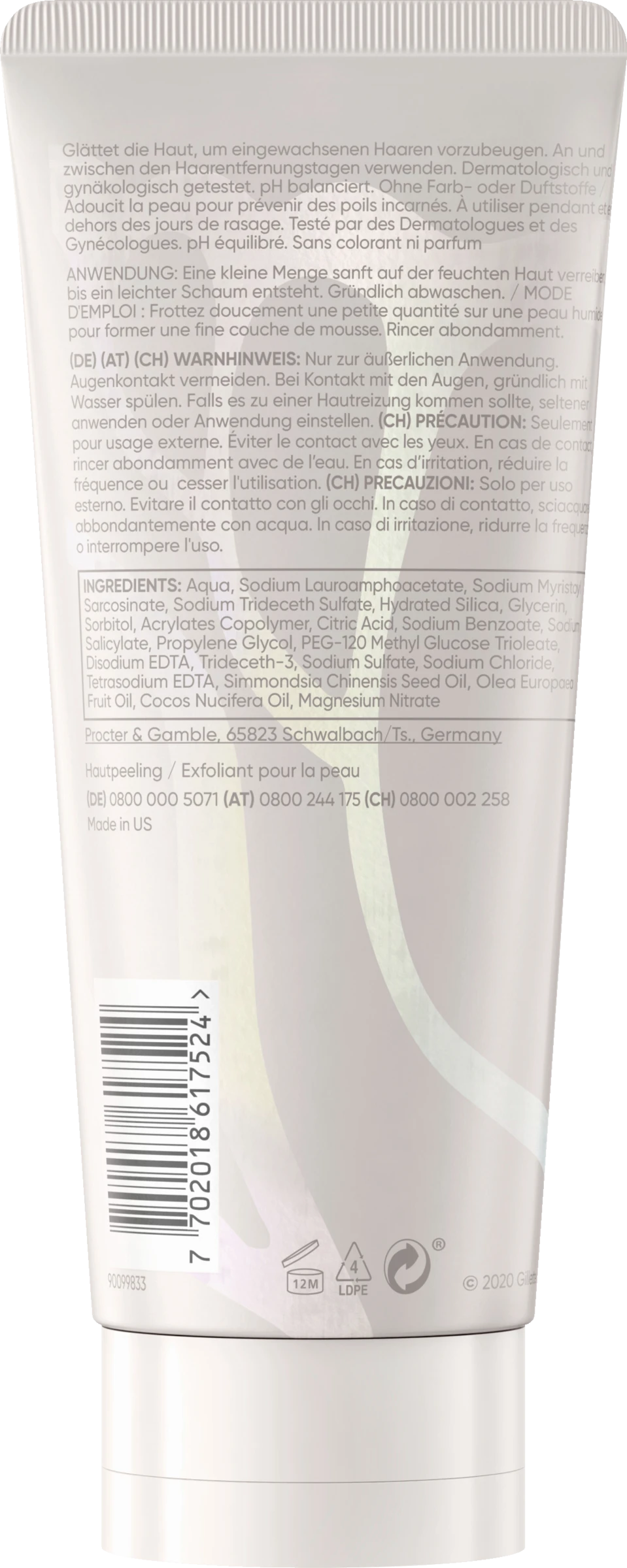 Das Satin Care Hautglättendes Peeling kann an oder zwischen den Haarentfernungstagen verwendet werden, um die Haut zu glätten, und hilft, vor Verletzungen zu schützen. Es peelt sanft, um abgestorbene Hautzellen, Talg sowie Schmutz und Fette auf der Hautoberfläche zu entfernen, die zu eingeschlossenen oder eingewachsenen Haaren führen können. Dermatologisch und gynäkologisch getestet.