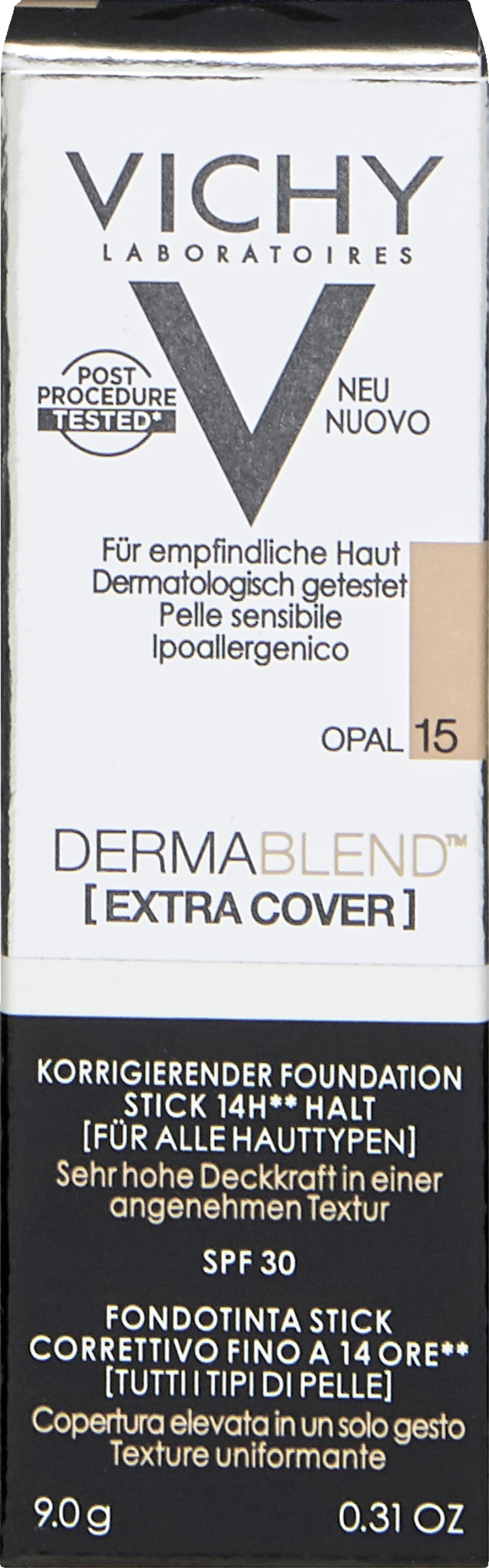 Der DERMABLEND Extra Cover Stick 14h von Vichy ist ein hochpigmentierter Foundation Stick, der Unebenmäßigkeiten sofort kaschiert. Der Make-up Stick deckt Rötungen ab und schützt die Haut dank LSF 30 vor UV-Strahlung.